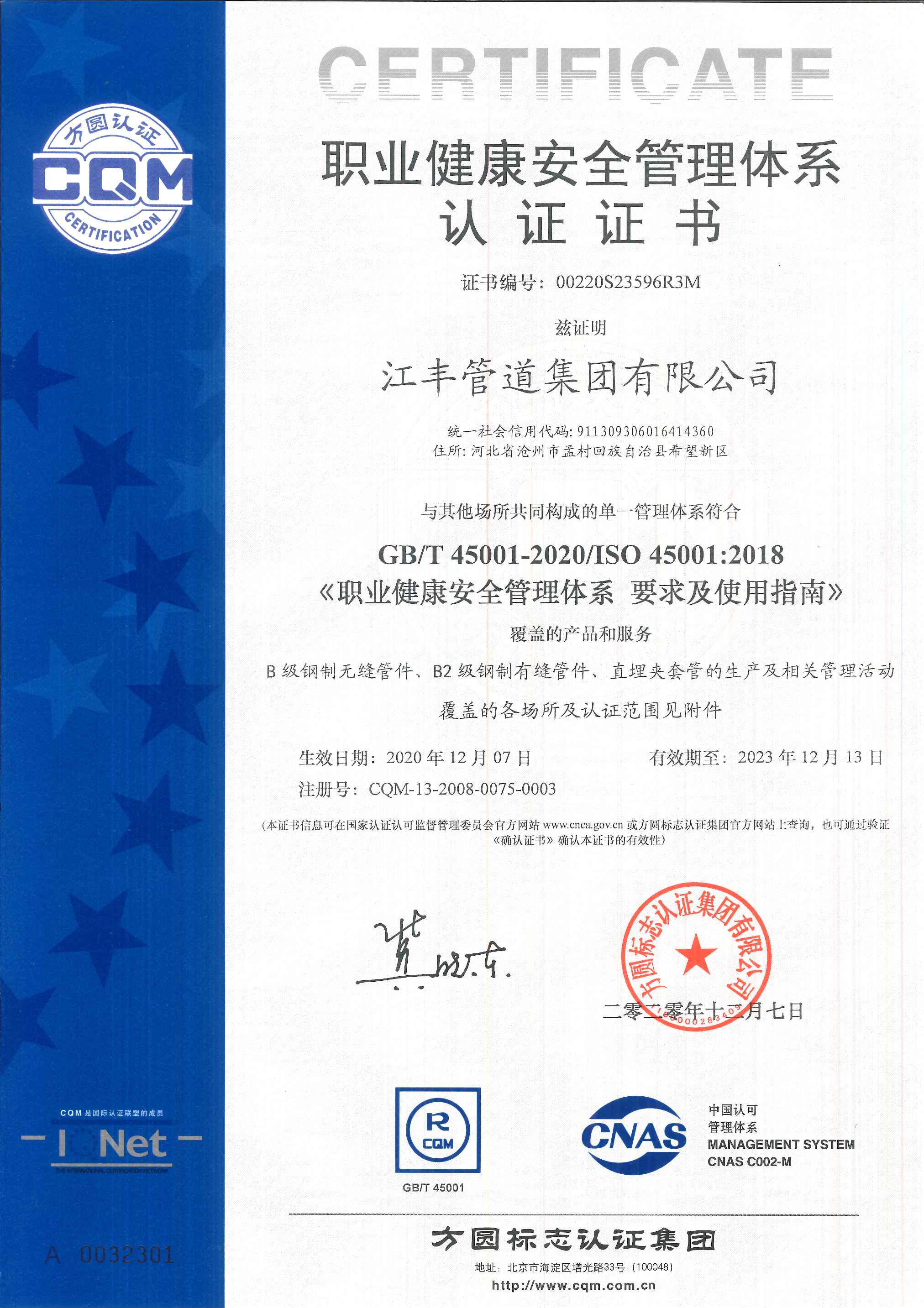 職業健康安全管理體係認證證書